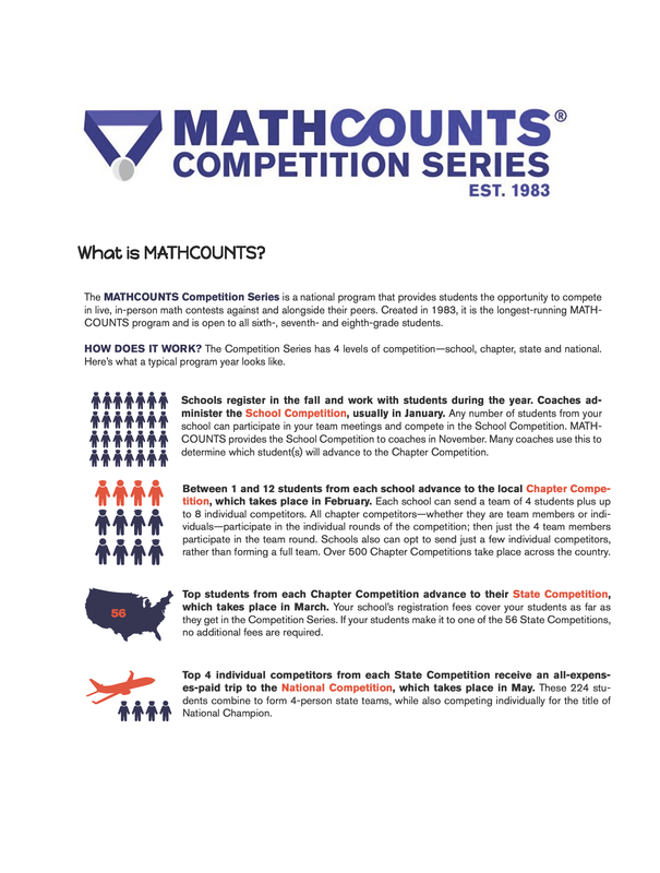 The MATHCOUNTS Competition Series is a national program that provides students the opportunity to compete in live, in-person math contests against and alongside their peers. Created in 1983, it is the longest-running MATHCOUNTS program and is open to all 6th, 7th, and 8th grade students.